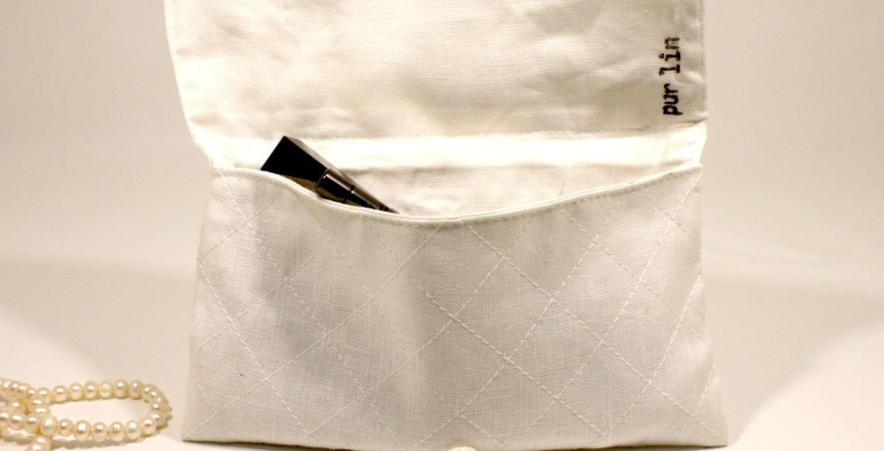 Toujours en partant de mon tissu fétiche, je propose deux formats de pochettes. La première, blanche, matelassée avec du molleton de coton, est fermée avec un bouton de nacre. Sobre et élégante, elle permet de ranger maquillage, savons, brosses…